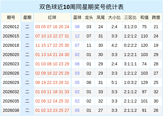 和值分析:近十周同星期二的奖号和值平均值100.30,上周星期二的奖号和值低于平均值,预测本周星期二的奖号和值会高于平均值,参考129;